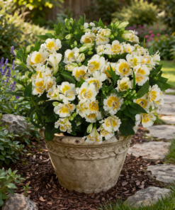 Alstroemeria Yentl doskonale sprawdza się w pojemnikach, na balkonach, tarasach oraz na frontach rabat 💚 Jej jasne, biało-żółte kwiaty rozświetlają kompozycje i nadają im lekki, elegancki charakter. Takie zastosowanie dobrze pasuje do przeznaczenia całej serii Colorita® do ogrodu, tarasu i patio.